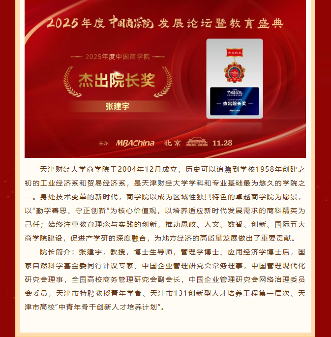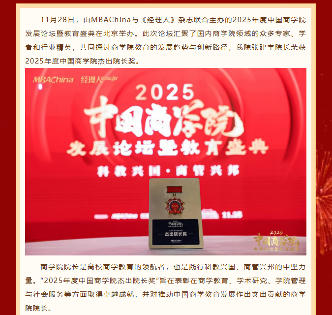 喜报 | 我院张建宇院长荣获2025年度中国商学院杰出院长奖